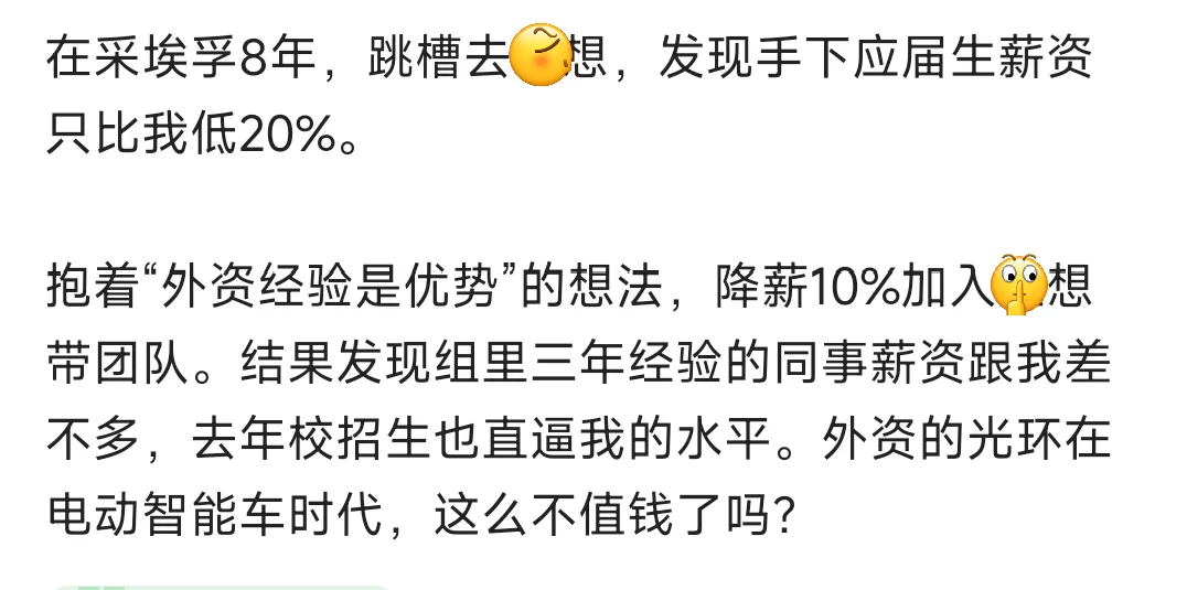 采埃孚离职员工爆料:在采埃孚8年,跳槽去某想,发现手下应届生薪资只比我低20%.抱着"外资经验是优势"的想法,降薪10%加入公司带团队.