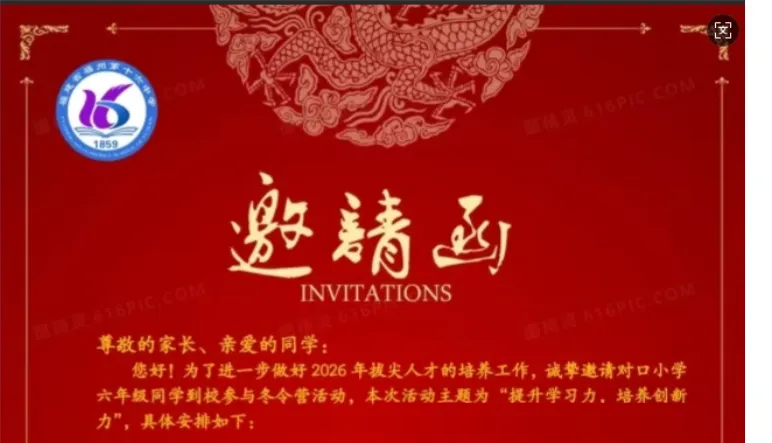 尊敬的家长、亲爱的同学:您好!为了进一步做好2026年拔尖人才的培养工作,诚挚邀请对口小学六年级同学到校参与冬令营活动,本次活动主题为“提升学习力,培养创新力”,具体安排如下:一、活动信息学生报到时间:2026年1月29日(上午8:15、下午2:30)学生放学时间:2026年1月29日(上午11:30、下午5:00)学生报到地点:福州第十六中学北门(麦园路35号)家长会时间:2026年1月29日下午4:00家长会地点:福州第十六中学学术报告厅(邀请每个家庭1位家长代表来参与活动)二、课程安排1月29日上午文化课程——参观校园科学教育——纸飞机的秘密化学实验——玩转泡腾片综合实践——点亮思维火花1月29日下午科学教育——趣味编程生物实验——微观看世界三、报名方式私信各班班主任