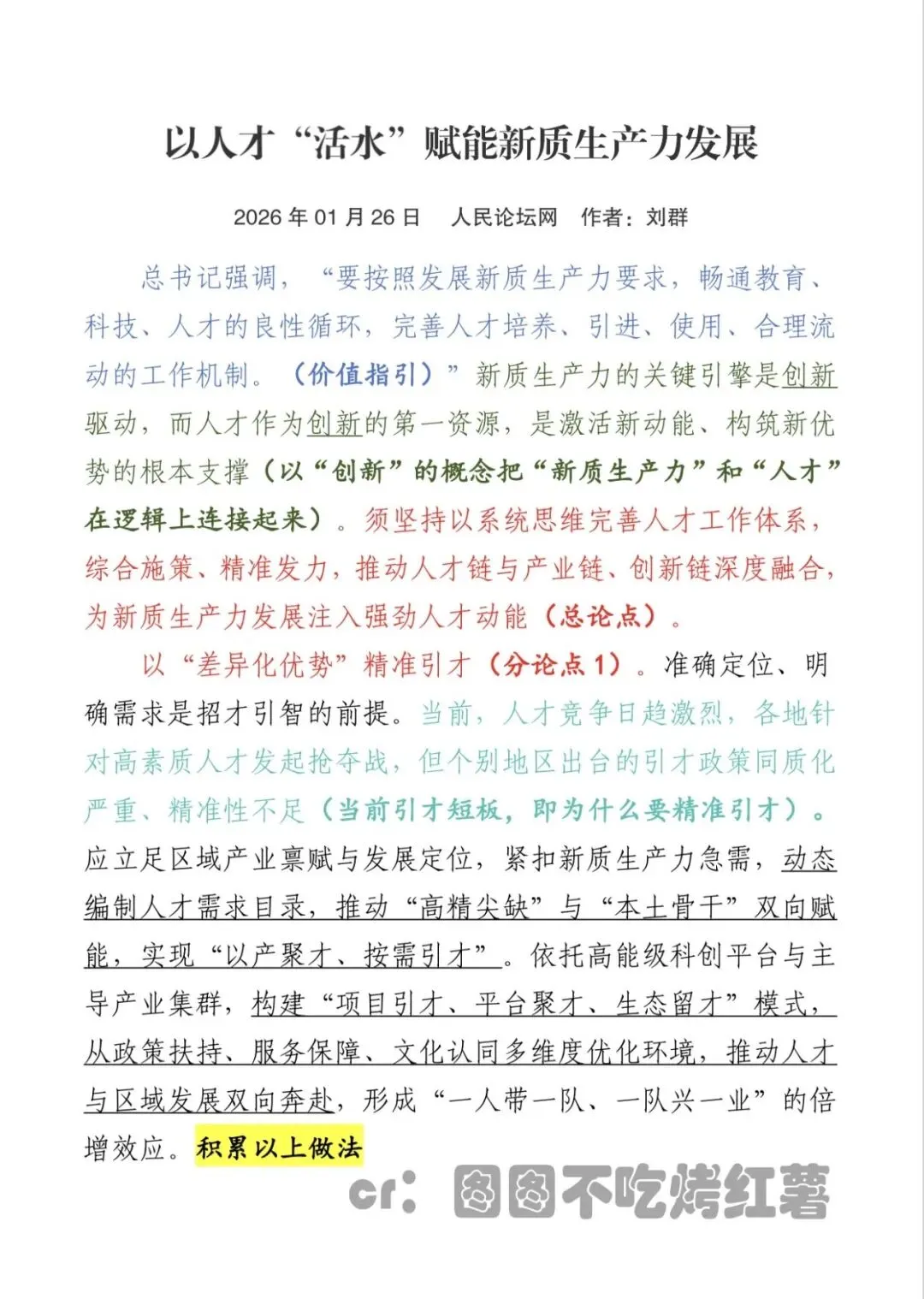 《以人才“活水”赋能新质生产力发展》这篇文章重在积累精准引才、科学育才、高效用才三个分论点及其措施。这些措施表述十分新颖规范,是很好的积累素材👍👍