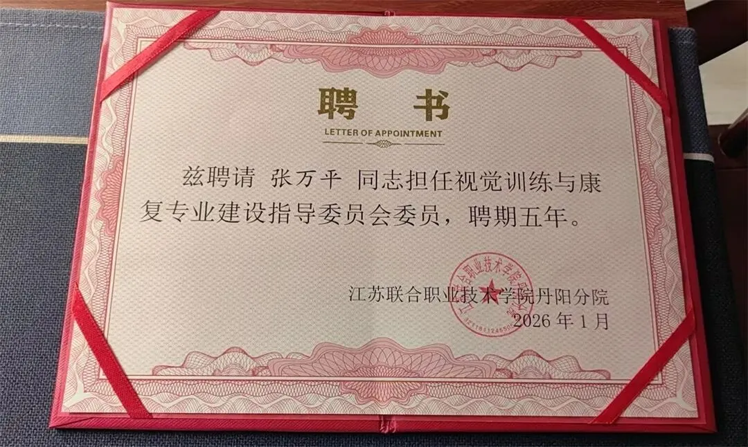近日,丹阳市江西商会常务副会长、丹阳明途职业培训学校校长张万平获聘江苏联合职业技术学院丹阳分院视觉训练与康复专业指导委员会委员,这一聘任不仅是对张万平校长在视觉训练与康复领域专业能力、行业实践经验的高度认可,更是校校携手深化产教融合、推动区域视康专业人才培养提质升级的重要举措。