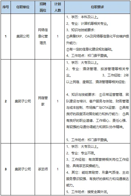 安徽省祁门红茶产业集团有限公司(简称:祁门红茶集团),成立于2022年,位于“祁红故里”平里镇。打造有祁门红茶智能化生产加工基地、祁红非遗手工坊、生态茶园示范基地、祁驿群芳最(茶文旅综合体)等业态,主营业务涵盖茶叶种植、生产、加工、销售、科研、电子商务、茶生态旅游开发和茶文化传播等。根据公司发展战略及目标规划,现通过黄山市众城人力资源有限公司面向社会公开招聘工作人员。现将有关招聘事项公告如下: