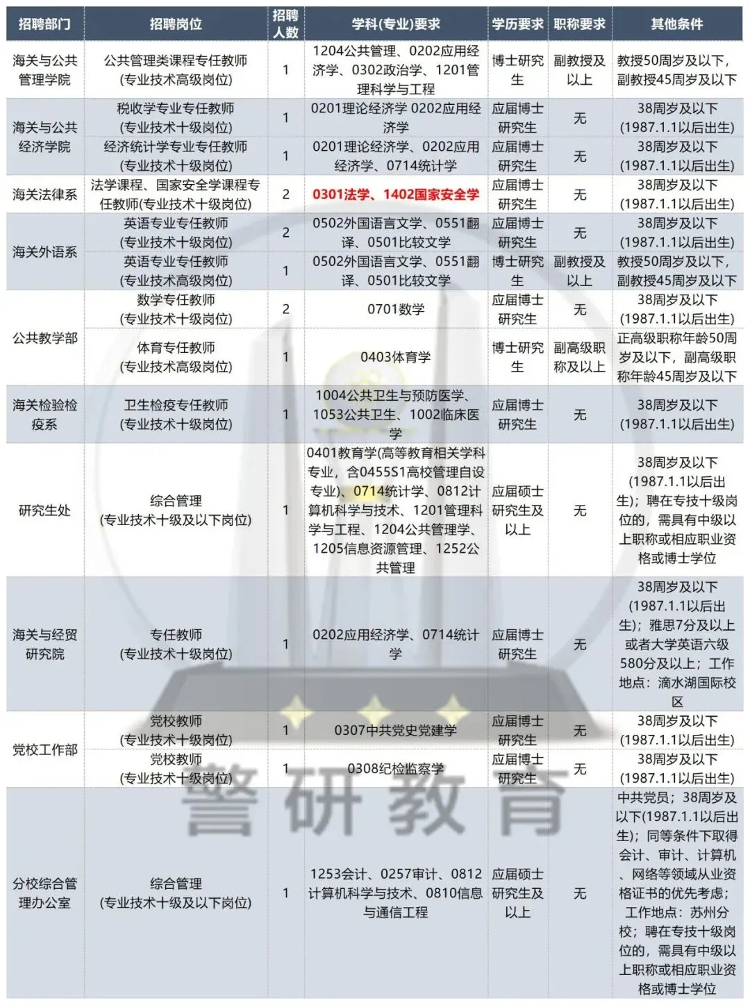 可报岗位来自海关法律系,法学课程、国家安全学课程专任教师(专业技术十级岗位),计划招收2人,38周岁及以下。