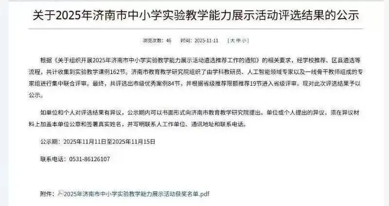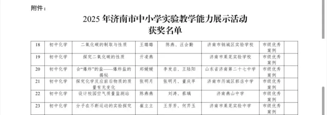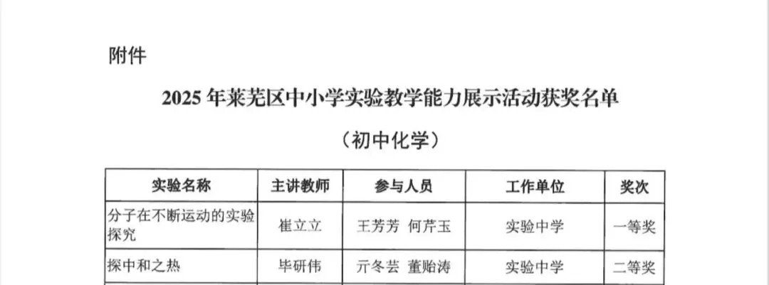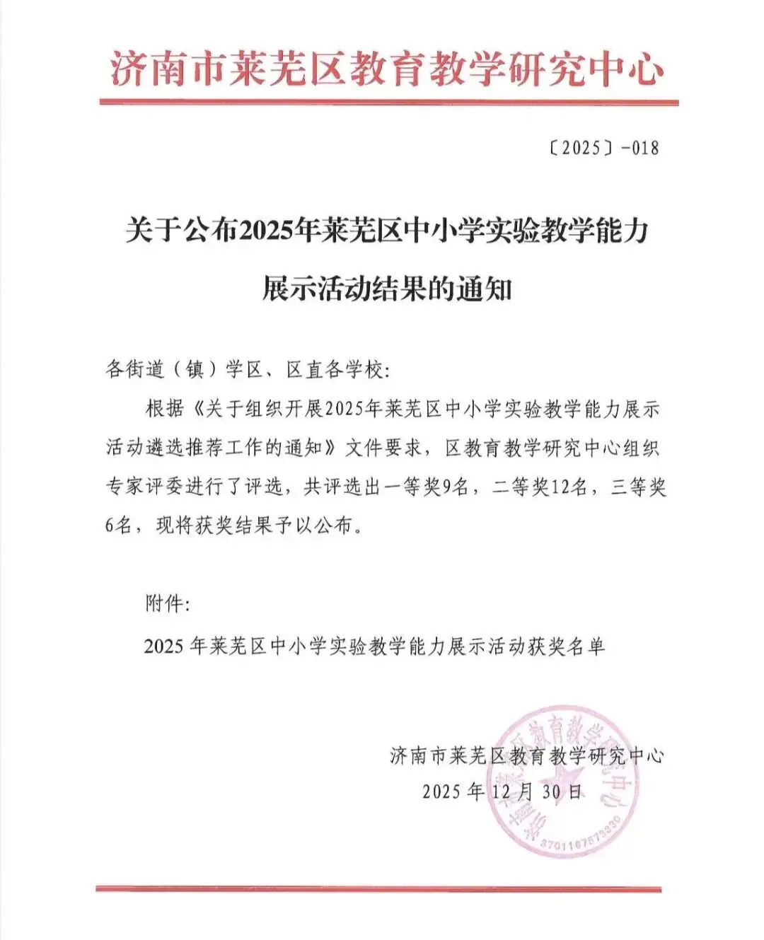 近日,莱芜区教育教学研究中心公布了2025年莱芜区中小学实验教学能力展示活动评选结果。我校师生凭借卓越的团队协作能力、新颖的创意和扎实的教学实验功底在展示活动中脱颖而出,再创佳绩!