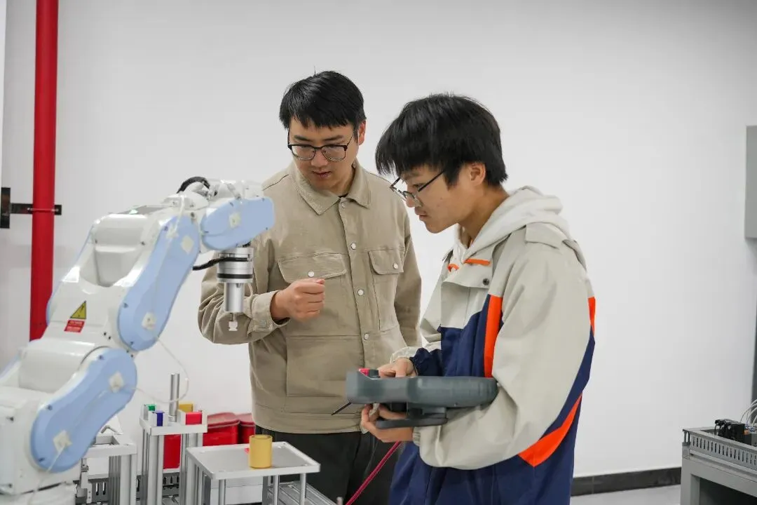 过去,学生学数控多在“黑板上画机器”,如今他们在工业级设备上动手实操。不远处,工业机器人实验室里,机械臂灵活舞动,精准完成搬运、装配等指令;2022年建成的网络布线实训室,模拟真实楼宇环境,让学生反复锤炼技能。