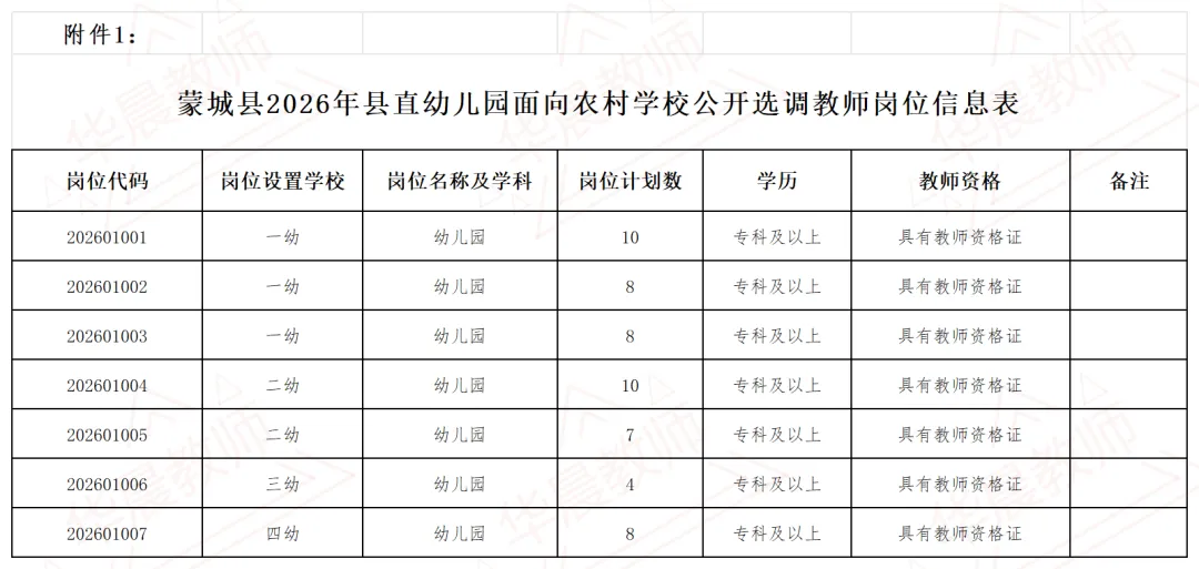 1.蒙城县2026年县直幼儿园面向农村学校公开选调教师岗位信息表