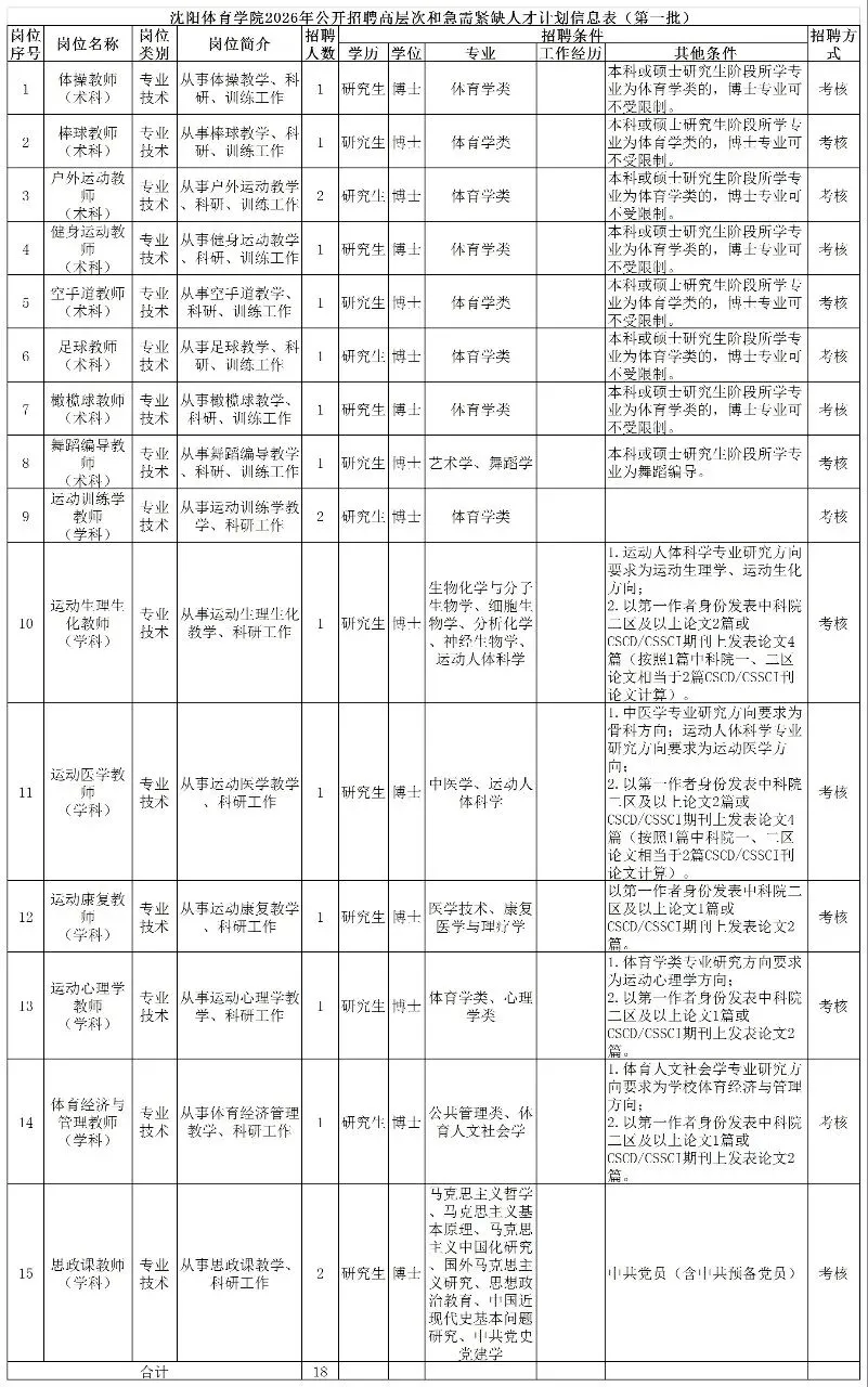 附件:沈阳体育学院2026年公开招聘高层次和急需紧缺人才计划信息表(第一批)