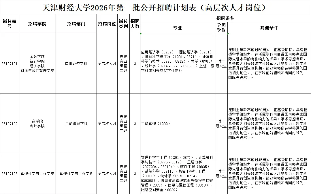 具体招聘岗位见《天津财经大学2026年第一批公开招聘计划表(高层次人才岗位)》(附件)。