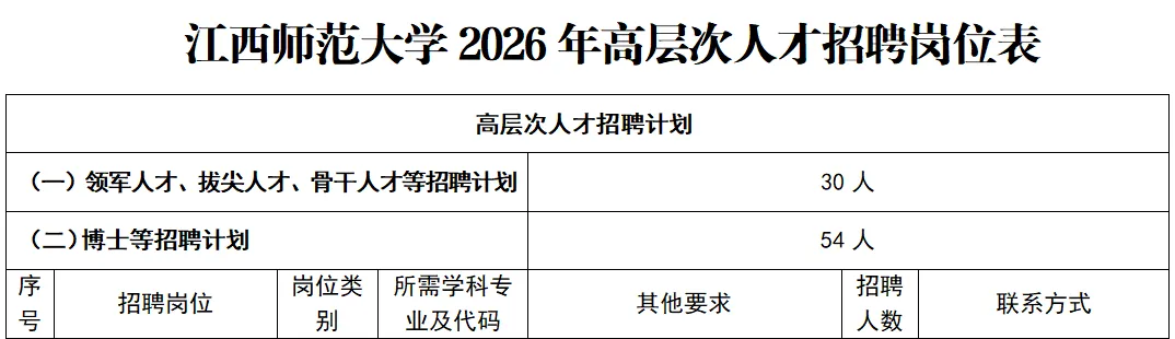 具体招聘岗位及要求详见《江西师范大学2026年高层次人才招聘岗位表》(附件1)。