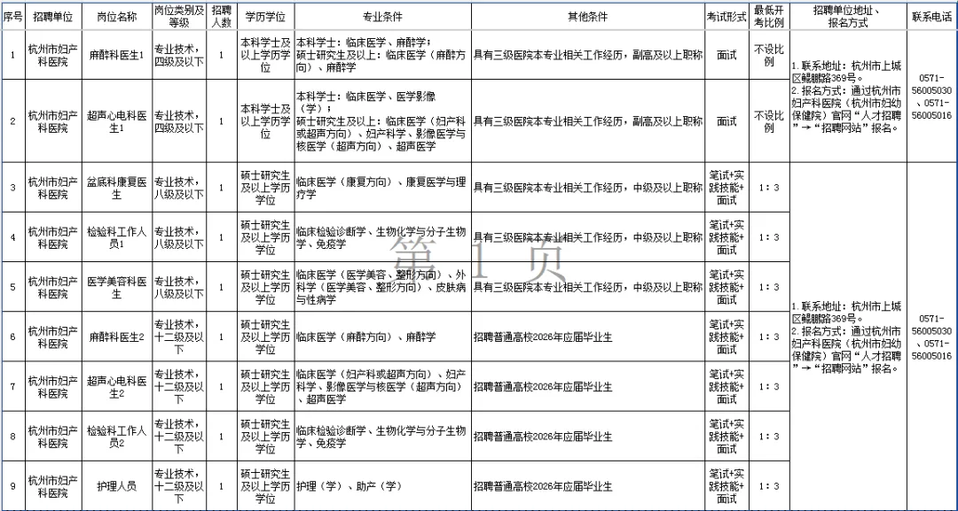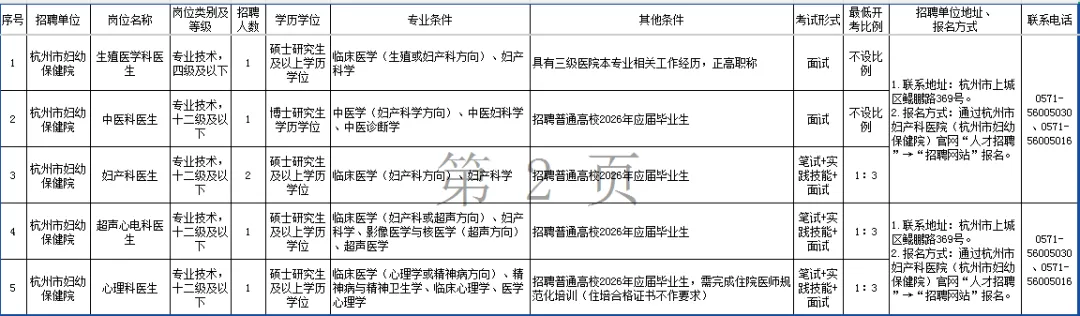 2026年上半年杭州市妇产科医院(杭州市妇幼保健院)高层次、紧缺专业人才招聘公告(总公告)根据工作需要,杭州市妇产科医院(杭州市妇幼保健院)决定面向社会公开招聘事业编制高层次、紧缺专业人才15名。按照《中共中央组织部 人力资源社会保障部关于进一步做好事业单位公开招聘工作的通知》(人社部发〔2024〕57号)和《关于进一步做好浙江省事业单位公开招聘工作的通知》(浙人社发〔2024〕72号)等文件规定,现将有关事项公告如下: