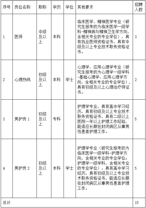 医师、心理热线、男护等岗位(附件1)。每人限报一个岗位,入职后服从统一调剂。