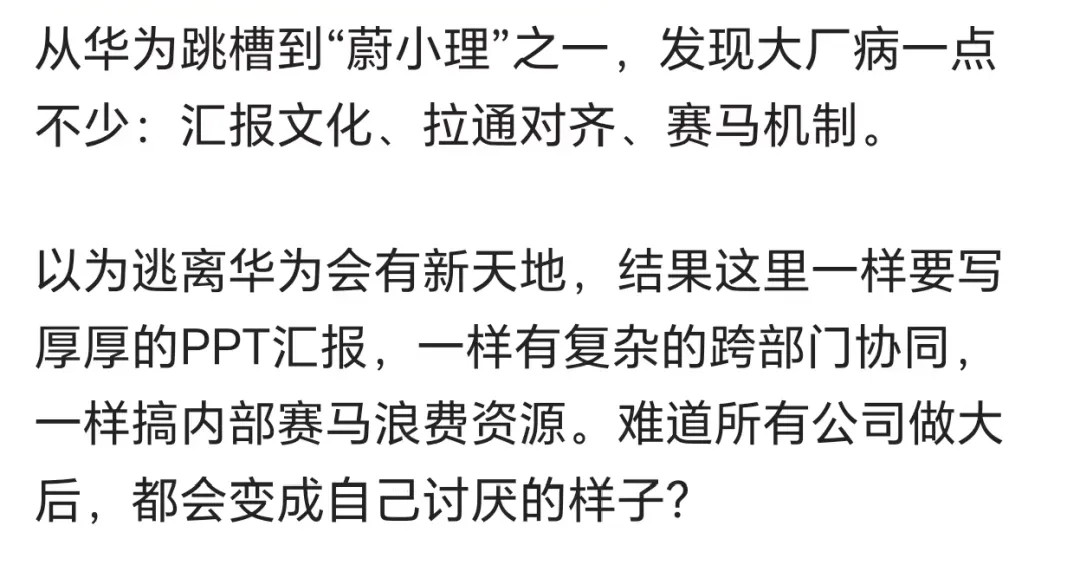 >华子离职员工爆料:从华子跳槽到"蔚小理",发现大厂病一点不少:汇报文化、拉通对、赛马机制.难道公司做大后,都会变成自己讨厌的样子!