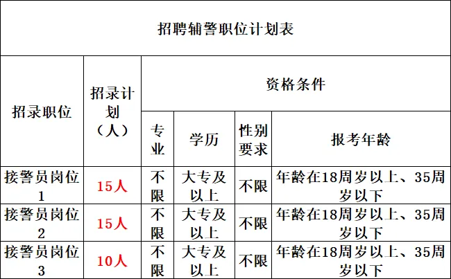 市公安局情指中心“一市一台”接警员40名。具体岗位及要求见附件1。