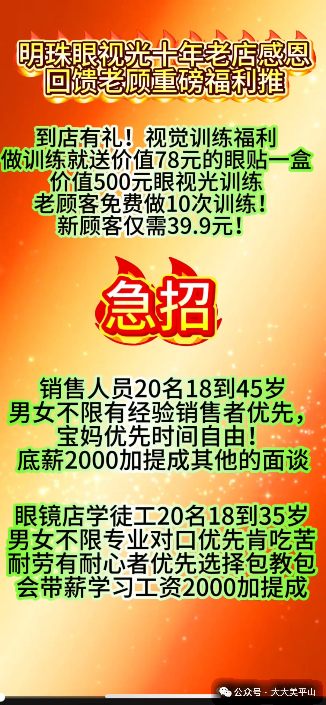 ▫️ 验光师/定配师/眼镜制作学徒20名(18-35岁):工资:2000➕提成,男女不限带薪学习,无需经验,专业老师手把手教学,学成后直接上岗,稳定职业前景等你来解锁!