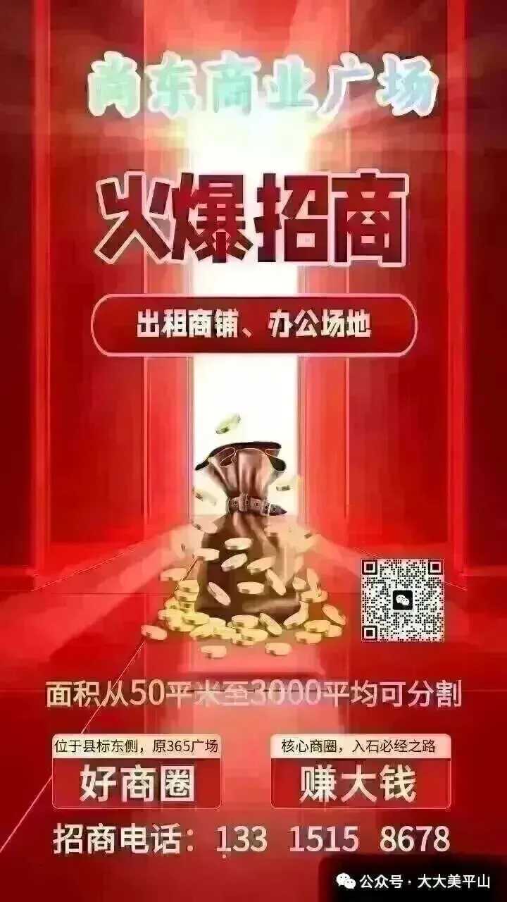 ▲平山尚东商业广场(在县标东边)火爆招商,有商铺、办公场地招商中,面积从50平米至3300平米均有,欢迎儿童娱乐、电玩、健身场馆、服装城、连锁酒店、公司办公、婚宴餐饮、教培机构等客户考察洽谈,合作政策宽松优惠。电话:13315158678王经理