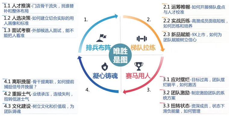 在开发课程之前,我们先通过深入访谈,识别出城市经理面临的最棘手、最高频的12大挑战场景,并将其归纳为四大模块:排兵布阵、梯队拉练、赛马用人、凝心铸魂。12大场景,便是12场真实“战役”。我们依据这些“原汁原味”的真实案例,打造了全真案例模拟课程。