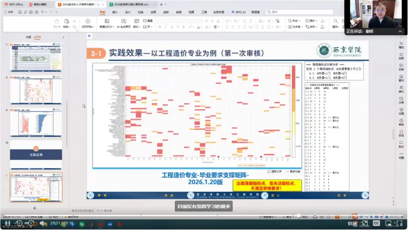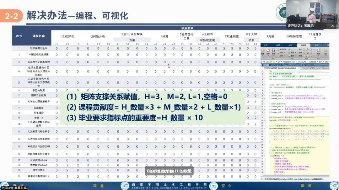 同时,土木工程学院副院长张海龙围绕课程-毕业要求关联度矩阵审核中存在的“某指标点缺支撑、某课程未提供支撑、H支撑不足、支撑设置不合理”等问题,提出了一套计算方法和应用,并以工程造价专业为例进行了操作分享,实现了课程-毕业要求关联度矩阵的可视化。