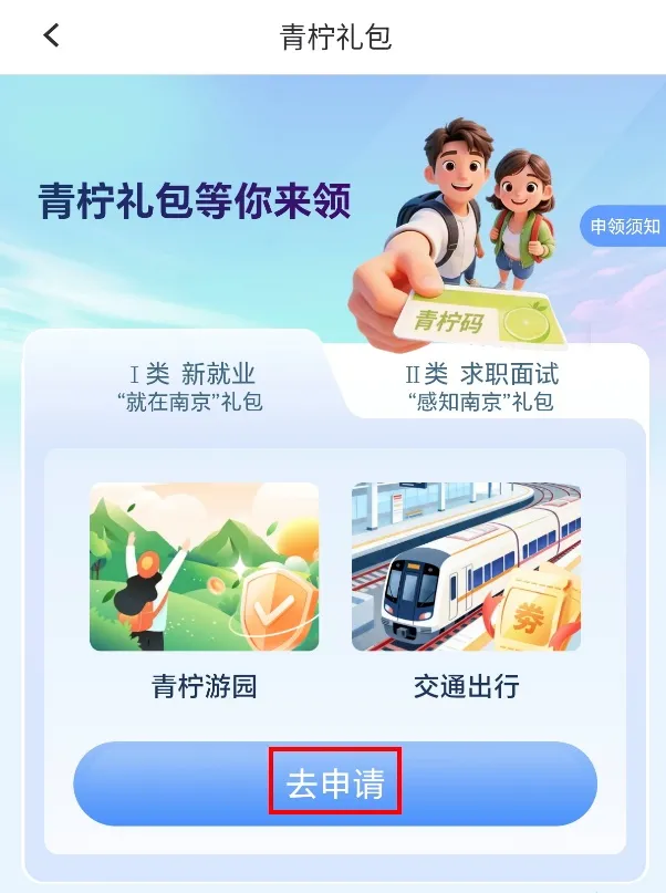 途径一:扫码关注“南京人社”微信公众号—点击“人社服务”栏目,选择“青柠礼包”,或者“南京市人才服务中心”微信服务号—点击“热点资讯”栏目,选择“青柠礼包”。