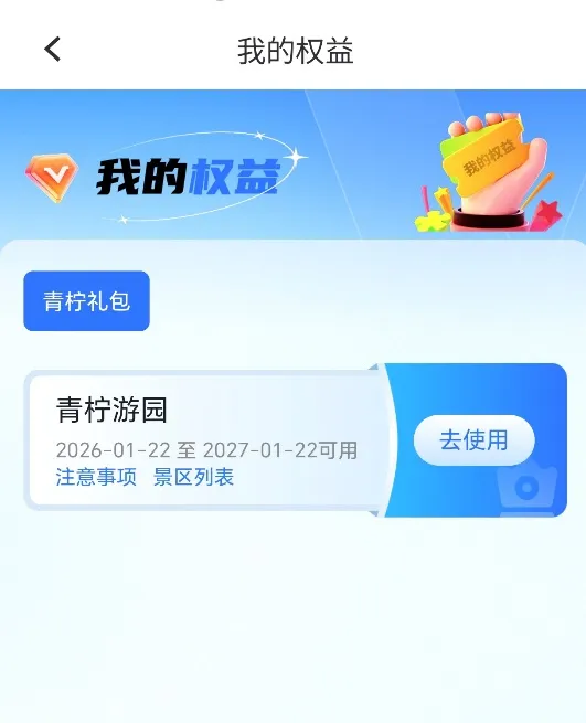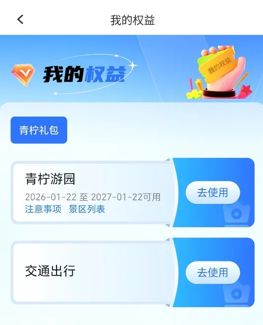 4.审核通过后,在“我的权益”中查看青柠礼包,第一类人才领取青柠游园服务和交通出行服务,第二类人才领取青柠游园服务。点击对应服务[去使用],激活成功后即可使用相应服务。