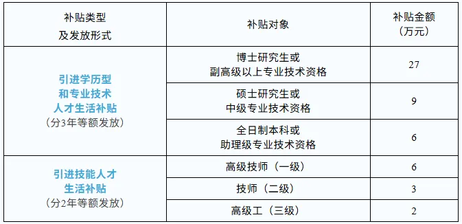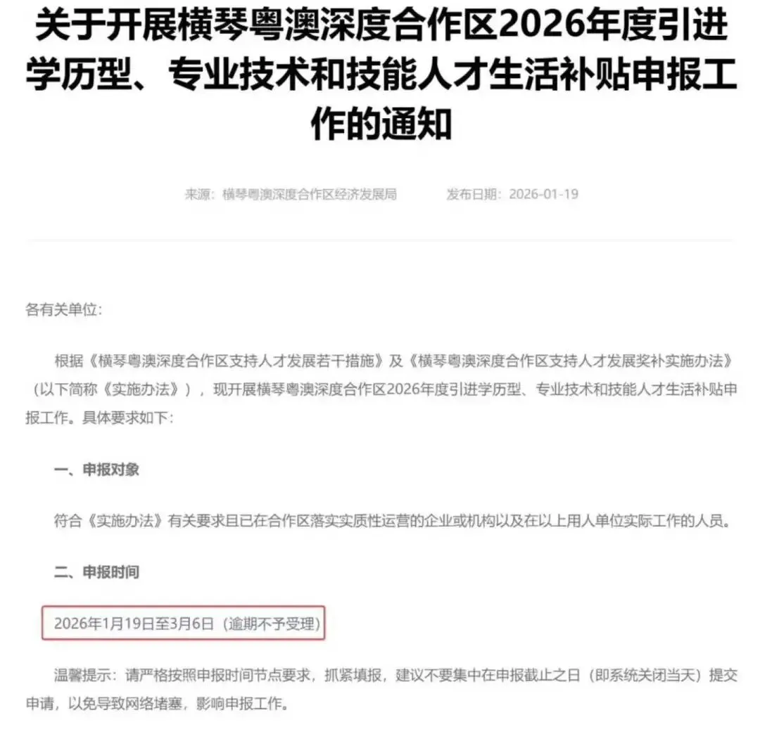 横琴粤澳深度合作区2026年度引进学历型、专业技术和技能人才生活补贴申报工作已开启,申报期为2026年1月19日至3月6日。符合条件的引进学历型和专业技术人才最高可得27万生活补贴,引进技能人才最高可得6万生活补贴。