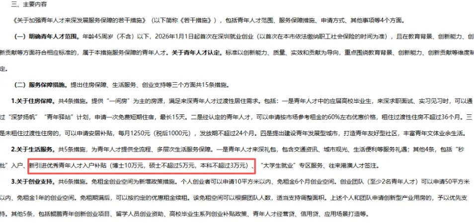 深圳《关于加强青年人才来深发展服务保障的若干措施》明确新引进优秀青年人才入户补贴,其中硕士不超过5万元。