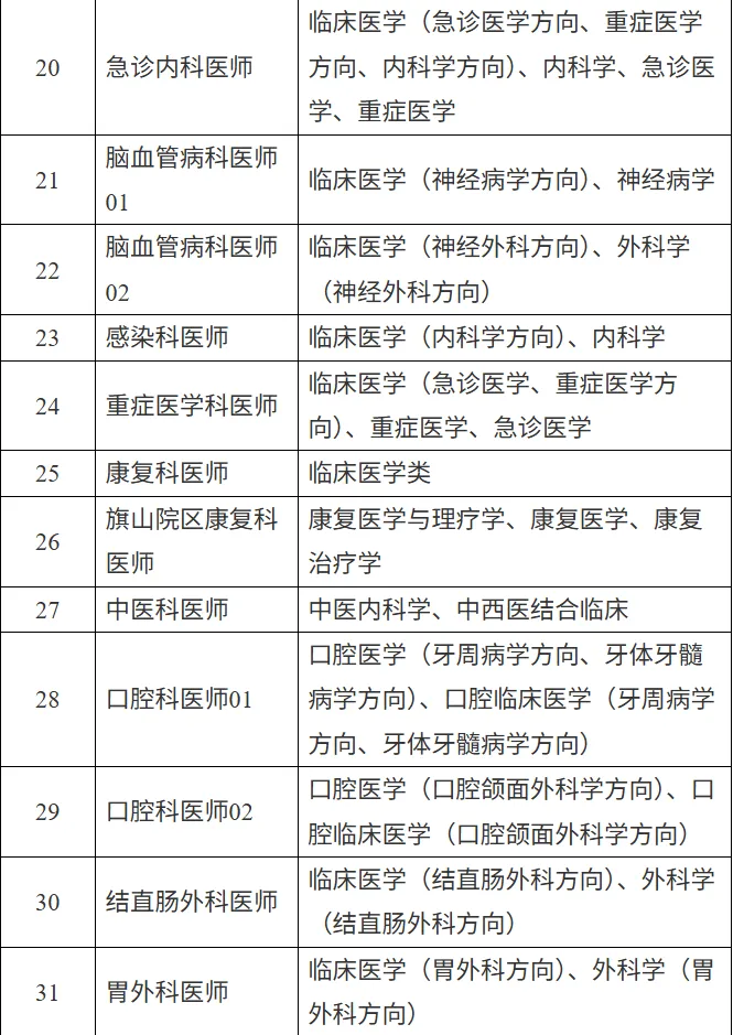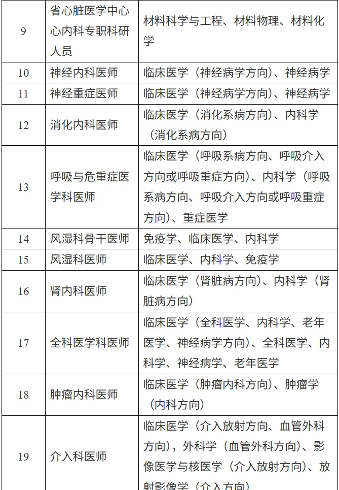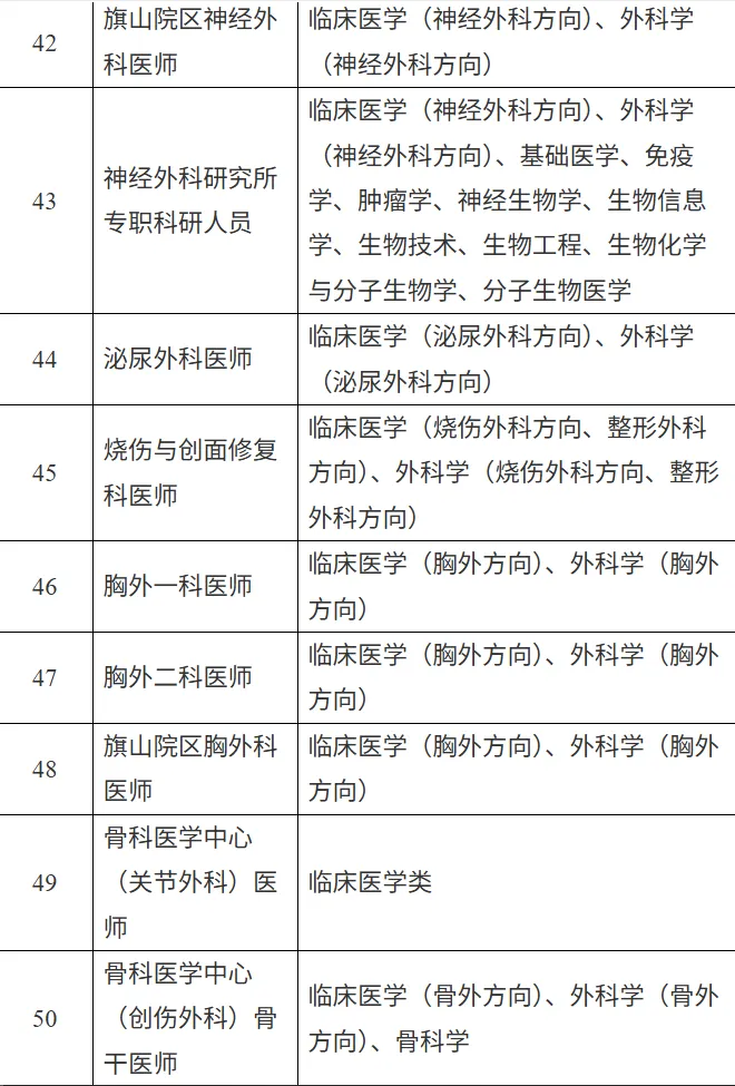 百年协和,“医”脉相承。从守护生命的初心出发,到永攀医学高峰的征程,福医协和始终是人民的医靠。2026年福医协和医院高层次人才招聘预热开始!具体岗位及要求以官网正式发布的招聘公告为准。我们诚邀医学领军者、青年学术骨干加入,以仁心为帆,以医术为桨,与福医协和并肩,共筑守护全民健康的坚固防线,书写医学事业的崭新篇章。一、医院概况1.薪火相传,镌刻医学百年印记百年协和,源远流长,福建医科大学附属协和医院前身是福州基督教协和医院,为创建于1860的福州圣教医院与创建于1877年的马高爱医院合并而成。是中国历史上有记载的第三家西医医院,是八闽现代医学的发祥地,更是当时最早被国人所接纳的西医医院。2.规模雄厚,筑牢诊疗服务根基医院现有员工5000余人。其中正、副高职称(含教授、副教授)近700余人。拥有国家级、省部级、享受政府特殊津贴专家等高层次人才百余名,多位专家进入中国名医百强榜、学术影响力百强榜。除院本部于山院区外,还拥有旗山院区、平潭院区、妈祖院区三个院区。年门诊病人212万人次,年收治住院病人18万余人次,开展各类手术14万余台(其中住院部Ⅲ、Ⅳ级手术达85%以上,Ⅳ级手术达45%以上)。3.综合领先,荣获多项权威认可医院综合实力雄厚。跻身“亚洲华人地区最佳医院百强”“中国·东盟最佳医院百强”“全国医院综合实力百强榜”“中国医院科技影响力百强榜”“中国医院竞争力·顶级医院百强榜”“转化医学全国五十强”。系国家综合类区域医疗中心、国家心血管病区域医疗中心、国家首批疑难病症诊治能力提升工程、福建省高水平医院。拥有11个国家临床重点专科、4个福建省高水平临床医学中心、24个福建省临床重点专科、5个省级重点实验室。在国家卫健委已开展的三级公立医院绩效考核中,成绩为A+。尤其可喜的是CMI值(Case Mix Index,国际公认的衡量一所医院疑难危重症疾病救治能力的客观指标)居全国前列,福建省首位,标志我院救治疑难危重疾病的能力达国内先进水平。4.筑巢引凤,赋能人才全面成长医院一贯重视人才培养,制定多项人才培养和支持制度,高水平的发展平台能让您更好地施展才华。百年发展的深厚底蕴、几代协和人的严谨、求精、勤奋、奉献铸就的辉煌,定能给您的成长插上有力的翅膀。近年来,医院制定《国内骨干进修管理办法》《学科带头人后备人选出国进修的管理规定》《人才引进和管理暂行办法》《青年人才培养和支持计划实施办法》《专职科研工作管理办法》《在职优秀青年博士科技项目实施方案》等院内人才培养管理办法,围绕国内外进修研学、院内人才层次认定、科研启动金、绩效待遇、生活津贴、安家费等方面切实保障人才的各项待遇。二、基本条件1.具有中华人民共和国国籍,拥护中国共产党的领导,热爱社会主义,遵纪守法,品行端正。2.热爱卫生健康事业,恪守医生职业道德规范,具有良好的思想政治素质、职业道德和团结协作意识。3.身体健康,符合公务员录用体检标准。4.应聘者需具备岗位相关专业知识及技能,专业审核以毕业证书上的专业名称为准。5.年龄要求:以官网正式发布的岗位表为准,特别优秀者年龄可适当放宽。6.学历学位要求:研究生学历、博士学位。7.从海外(境外)引进的博士研究生,原则上,本科阶段需为全日制本科,且博士研究生需毕业于国际知名四大世界大学排名之一最新排名前500的大学,或所学专业在国际知名四大世界大学排名之一最新学科排名前100,并提供教育部留学服务中心出具的学历学位认证书。国际知名四大世界大学排名以上海软科(ARWU)世界大学排名、QS世界大学排名、泰晤士高等教育(THE)世界大学排名、U.S.News世界大学排名为准。8.学历学位认证书等各项资格认定及证明材料的截止时间为2026年12月31日。三、人才待遇1.纳入事业单位正式编制管理,按编制内人员待遇执行。受聘人员享受国家和福建省规定的事业单位工作人员相应的工资及社会保险等待遇。2.符合院内高层次人才认定相关条件要求的,按规定给予科研启动经费、住房补助、安家费等。3.符合福建省高层次人才或福建省年度紧缺急需人才引进指导目录等相关人才政策的,可按照相关政策申请相关人才身份及待遇。四、招聘岗位及专业要求