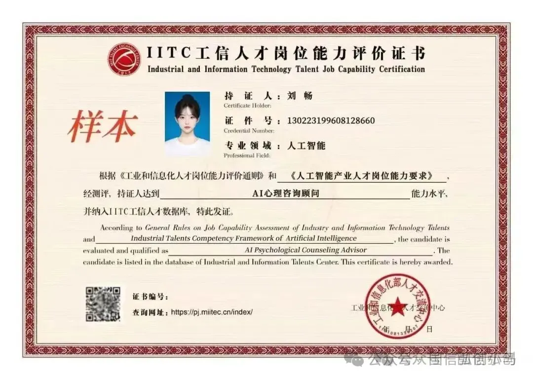 AI心理咨询顾问证书是工业和信息化部人才交流中心(以下简称“中心”)推出的IITC工信人才岗位能力评价项目之一,旨在培养“心理学+AI技术”复合型人才,应对“AI+心理”赛道的人才缺口。证书由中心(工信部直属公益二类事业单位)颁发,是数字化心理健康服务领域的权威能力证明,可通过中心官网查询验证,且纳入“IITC工信人才数据库”,作为企事业单位招聘、晋升、薪酬调整的参考依据。