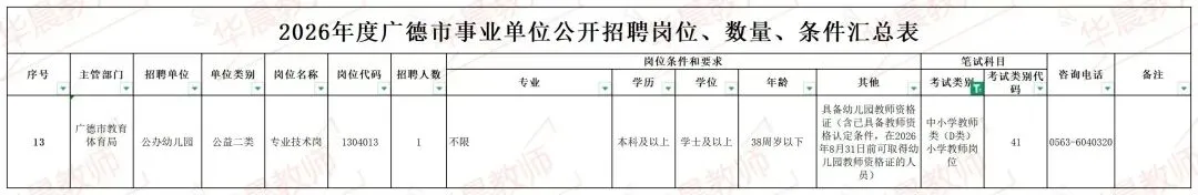 招聘单位咨询电话:详见《2026年广德市事业单位公开招聘工作人员岗位、数量、条件汇总表》