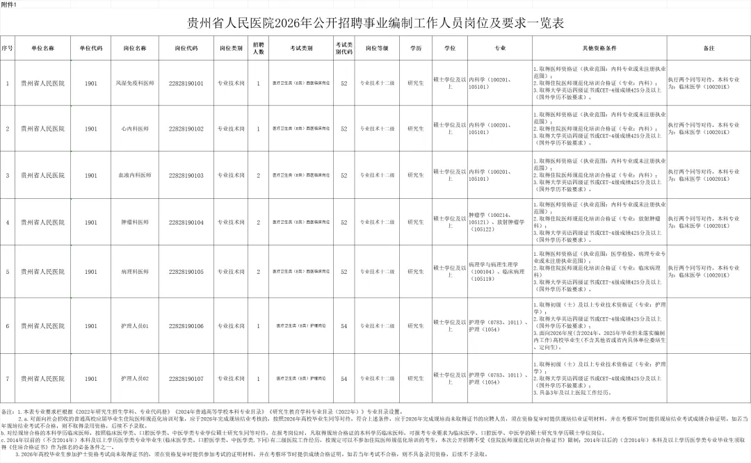 面向社会公开招聘工作人员10名,其中专业技术人员10名。具体招聘岗位及要求见《贵州省人民医院2026年公开招聘事业编制工作人员岗位及要求一览表》(附件1)。岗位表中明确为面向2026年度高校毕业生的,是指毕业时间为2026年1月1日至12月31日的专科(含高职)及以上高校毕业生,并面向2024年、2025年度毕业但未落实编制内工作的高校毕业生开放,且不对其是否有工作经历、缴纳社保作限制。岗位表中要求的基层工作经历时间计算,截止时间为报名日最后一日。关于基层工作经历的范围界定和时间计算,详见附件3。