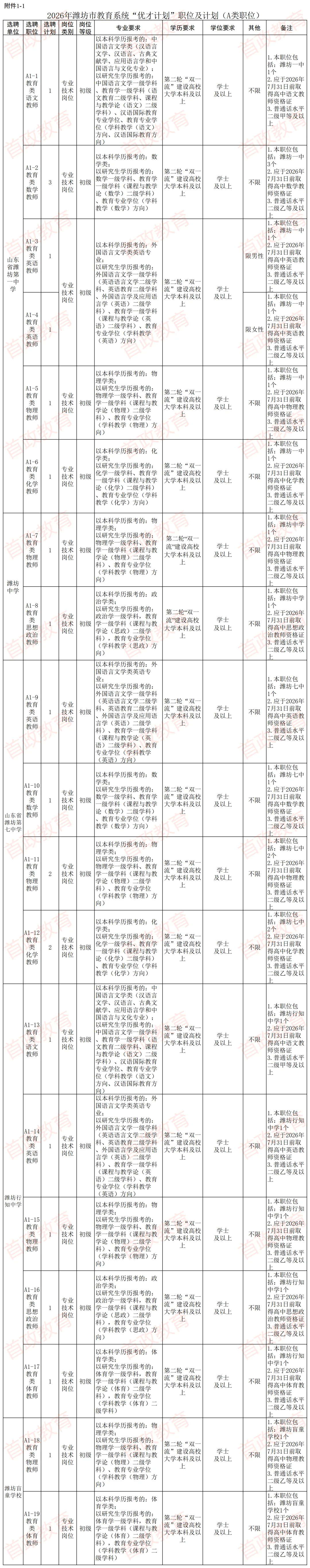 全市教育系统共计划选聘109名(选聘职位及计划见附件1)。选聘职位分为A、B两类,其中A类职位(潍坊市直学校职位)选聘23名,B类职位(县市区学校职位)选聘86名(选聘范围见附件2)。