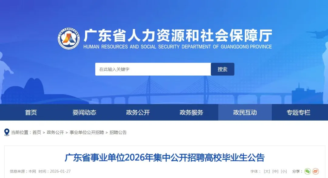 笔试于2026年3月举行,具体安排将在广东省人力资源和社会保障厅网站、广东人事考试网另行公告。
