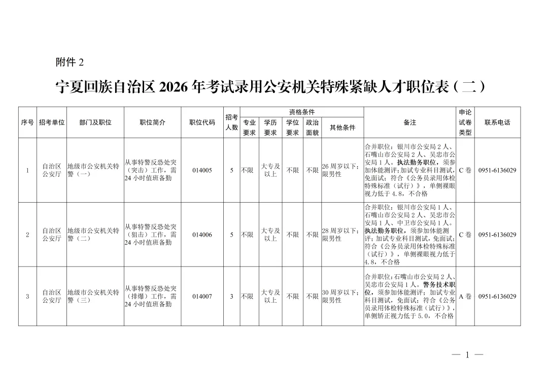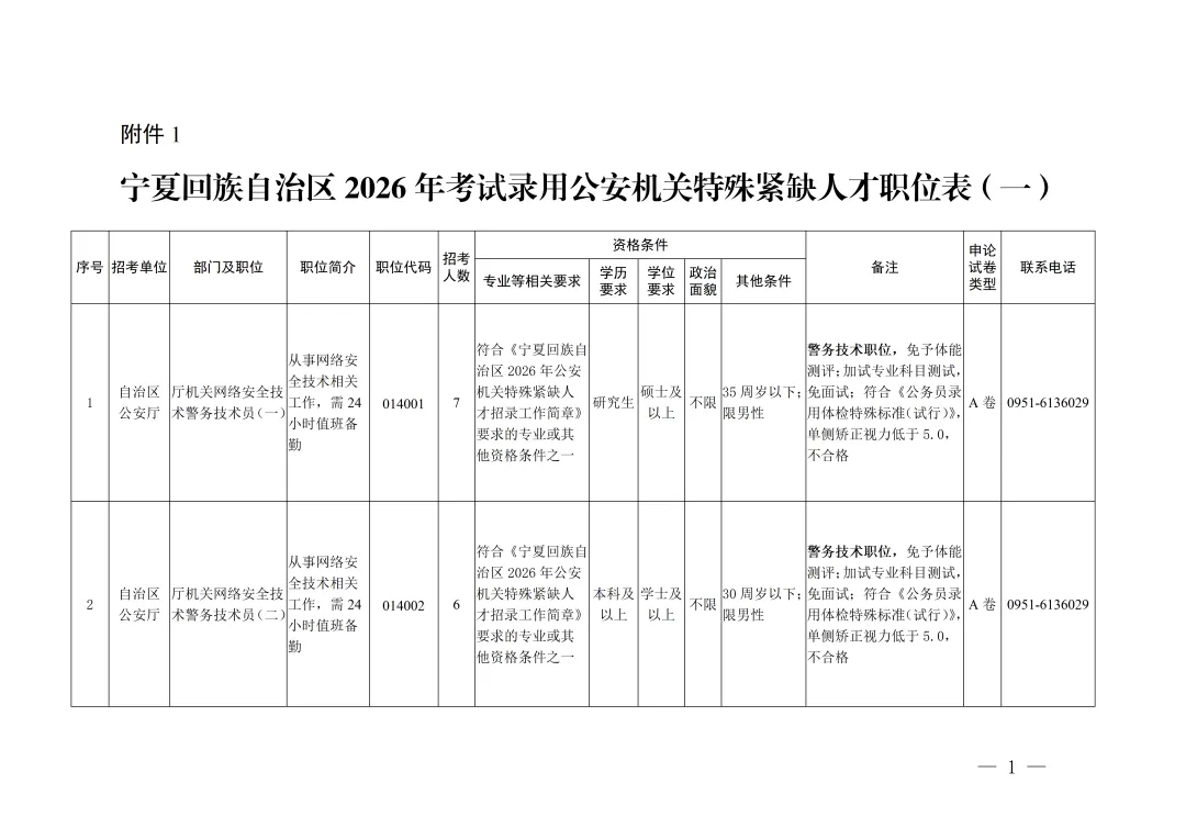 1. 宁夏回族自治区2026年考试录用公安机关特殊紧缺人才职位表(一)