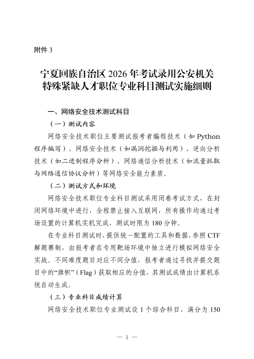 3. 宁夏回族自治区2026年考试录用公安机关特殊紧缺人才职位专业科目测试实施细则