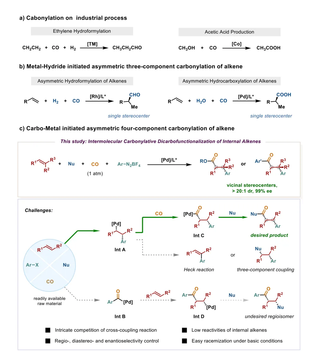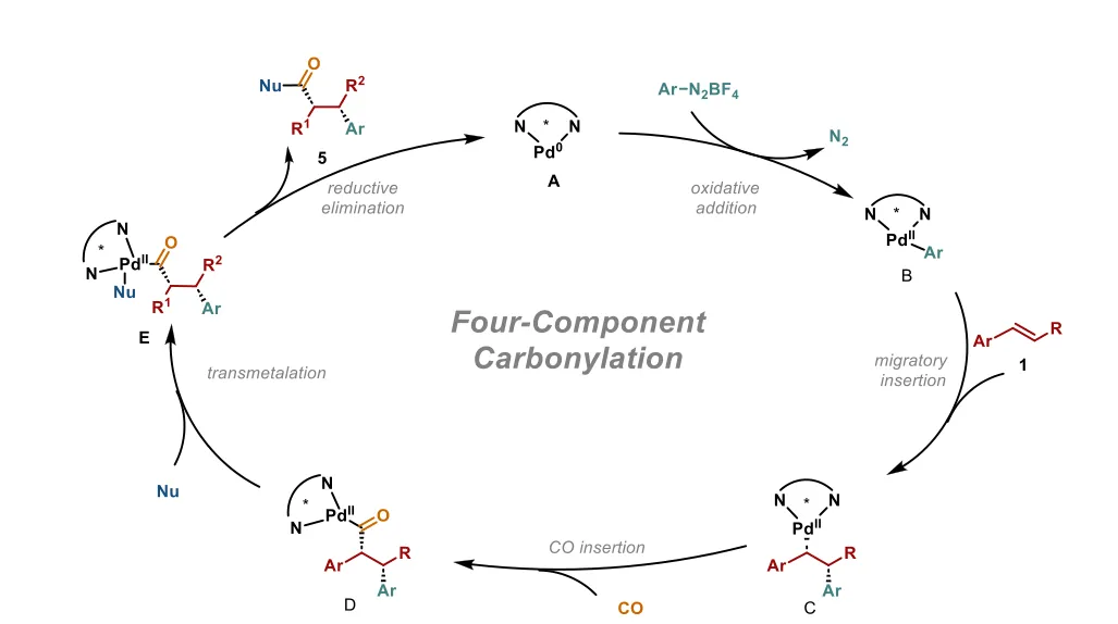 在本文中,作者报道了1大气压CO下钯(Pd)催化内烯烃、芳基重氮盐和亲核试剂的分子间四组分羰基化双碳官能团化反应。该方法可同时控制区域、非对映和对映选择性,高效构建无环手性羰基骨架中的拥挤相邻立体中心。亲核试剂的模块性使多种对映体富集的酯或酮以高产率和高立体选择性获得。温和条件可防止手性羰基的外消旋化,衍生化反应凸显了广泛的合成实用性。羰基化反应以一氧化碳(CO)为通用C1原料构建含羰基有机分子,是化学领域最具变革性的方法之一。它们构成了重要工业过程的基础,深刻影响日常生活,典型例子包括乙烯氢甲酰化制备醛和甲醇羰基化生产乙酸。在有机合成化学中,羰基化对于发现逆合成分析中的新策略性切断同样不可或缺,如Pauson-Khand反应在复杂分子合成中的应用。手性羰基结构单元(醛、酮、羧酸及其衍生物)在药物、农药和材料中的基本重要性,为推进催化不对称羰基化方法提供了令人信服的持久动力。尽管过渡金属催化烯烃的氢羰基化反应通常在升高的CO压力下进行,且通常由金属氢化物的迁移插入引发,可高效制备含单一立体中心的手性羰基化合物(代表性例子包括铑催化烯烃的不对称氢甲酰化和钯催化烯烃的氢羧化),但能够对映选择性构建含多个立体中心羰基骨架的直接一步策略仍极为罕见。现有制备此类复杂结构单元的方法通常需要多步序列,或存在模块性有限的问题。因此,开发通用的催化不对称羰基化方法,能够高效且模块化地安装羰基基团并对多个中心进行精确立体控制,是一个重要但具有挑战性的目标。不对称多组分反应(AMCRs)是有机合成中的强大范式,能够从三种或更多易得原料中一步直接、汇聚式组装具有高多样性的手性分子复杂性。这种内在效率使AMCRs成为开发新型不对称羰基化模式的有吸引力平台。本文致力于开发钯催化的四组分羰基化双碳官能团化反应,协同整合芳基亲电试剂、亲核试剂、烯烃和CO气体。关键的是,该方法体现了独特的反应机理:关键的立体选择性迁移插入通过金属-碳键(芳基-钯到烷基-钯)进行,与经典的由金属氢化物插入引发的氢羰基化途径(如钯-氢到烷基-钯)存在根本差异。这种新型C―M键插入途径有望直接构建含拥挤相邻立体中心的手性羰基化合物,该结构单元通过现有方法难以对映选择性获得。然而,实现这种四组分多组分反应面临持续的机理和选择性障碍:- 基元步骤竞争:芳基-钯(II)中间体遭遇烯烃与CO的发散配位,导致生产性1,2-迁移插入(生成烷基-钯(II)中间体A)或非生产性1,1-插入(生成酰基-钯(II)中间体B)。烷基-钯(II)物种A虽理论上可羰基化生成酰基中间体C,但易发生β-氢消除生成Heck型副产物;其与亲核试剂的直接转金属化则生成不含CO的三组分加合物。酰基-钯(II)中间体B易发生非生产性烯烃插入生成中间体D,后续转金属化会形成区域异构体。