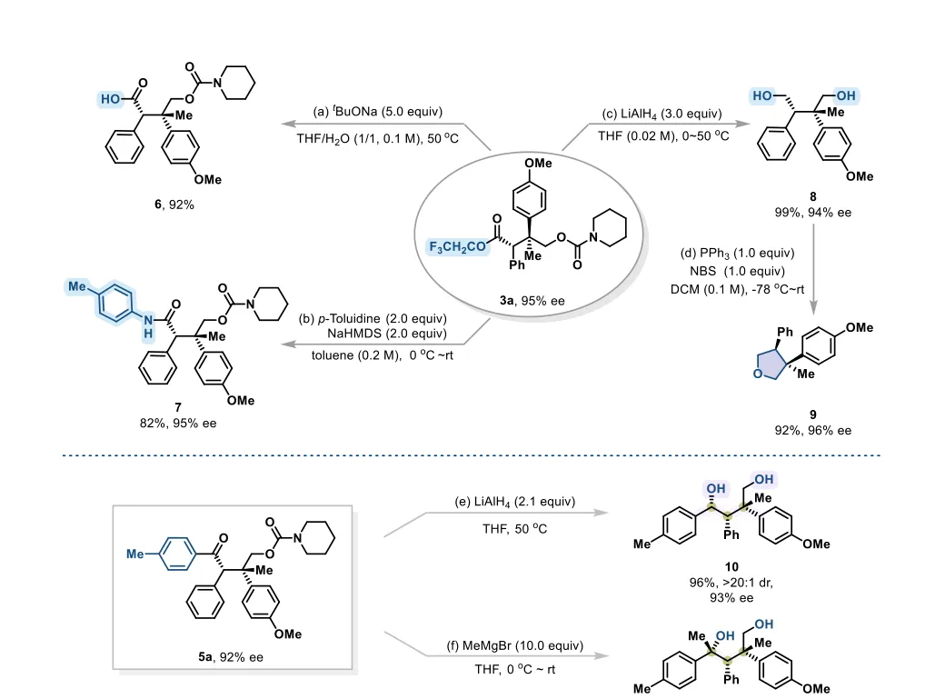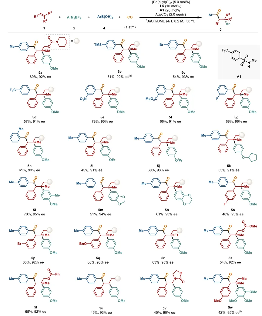 由于上述挑战,Pd(0)催化内烯烃的不对称分子间四组分交叉偶联反应基本未被探索。现有不对称羰基化方法多依赖分子内策略(通过烯烃与亲电/亲核试剂的tethering实现环化),虽适用于环状骨架,但范围受限。作者报道了1大气压CO下内烯烃的分子间不对称四组分羰基化交叉偶联反应,直接解决了这些局限性:使用芳基重氮亲电试剂避免强碱,消除外消旋化;新合成的手性双恶唑啉配体实现区域、非对映和对映选择性的同步控制,在拥挤相邻立体中心实现卓越立体区分;亲核试剂的模块性使α-手性酯(三氟乙醇)和含双立体元素的酮(芳基硼酸)的发散合成为可能;产物衍生化为有价值化合物进一步证明了合成实用性。图1 过渡金属催化不对称羰基化反应概述。(a) 工业应用中的代表性羰基化反应。(b) 金属氢化物物种立体选择性迁移插入引发的过渡金属催化末端烯烃不对称三组分羰基化反应。(c) 1大气压CO下钯催化芳基亲电试剂、亲核试剂与内烯烃的不对称分子间四组分羰基化交叉偶联反应。图2 三氟乙醇参与的不对称羰基化反应底物范围。反应条件:1(1.0当量)、2(3.0当量)、Pd(OAc)₂(10 mol%)、L5(10 mol%)、DTBMP(2.0当量)和Ag₂CO₃(20 mol%)在CF₃CH₂OH/PhCl(体积比=3/1,0.5 M)中、50℃、CO氛围(1.0 atm)下反应。报道分离产率,对映体过量(ee)通过手性高效液相色谱(HPLC)分析确定。图3 钯催化烯烃与芳基硼酸的不对称羰基化反应底物范围。反应条件:烯烃(1.0当量)、芳基重氮盐(3.0当量)、芳基硼酸(4.0当量)、[Pd(allyl)Cl]₂(5.0 mol%)、L5(10 mol%)和A1(N-甲基-4-(三氟甲基)苯磺酰胺,20 mol%)、Ag₂CO₃(2.0当量)在tBuOH/DME(体积比=4/1,0.2 M)中、50℃、CO氛围(1.0 atm)下反应。报道分离产率,对映体过量(ee)通过手性高效液相色谱(HPLC)分析确定。(a) 用L4代替L5,A1为1.0当量。(b) [Pd(allyl)Cl]₂(10 mol%),L5(30 mol%)。图4 合成应用。反应条件:(a) tBuONa(5.0当量),THF/H₂O(体积比=1/1,0.1 M),50℃;(b) p-甲苯胺(2.0当量),NaHMDS(2.0当量),甲苯(0.2 M),0℃至室温;(c) LiAlH₄(3.0当量),THF(0.02 M),0至50℃;(d) PPh₃(1.0当量),NBS(1.0当量),二氯甲烷(DCM,0.1 M),-78℃至室温;(e) LiAlH₄(2.1当量),THF(0.05 M),0至50℃;(f) MeMgBr(10.0当量),THF(0.1 M),0℃至室温。图5 提出的反应机理。综上,作者报道了1大气压CO下钯催化内烯烃的不对称分子间四组分羰基化双碳官能团化反应。该一锅法能够高效构建一系列含相邻季-叔立体中心或叔-叔立体中心的光学纯酯和酮,具有高化学、区域、非对映和对映选择性,以及优异的官能团耐受性。所得羰基化合物的进一步合成转化凸显了该方法的潜在实用性。作者预计,这种钯催化对映选择性多组分反应将激发更多关于含多立体中心复杂结构合成的研究。Palladium-Catalyzed Enantioselective Four-Component Carbonylative Dicarbofunctionalization of Internal Alkenes With 1 Atm CO. Angew. Chem. Int. Ed.,2026. https://doi.org/10.1002/anie.6399534.