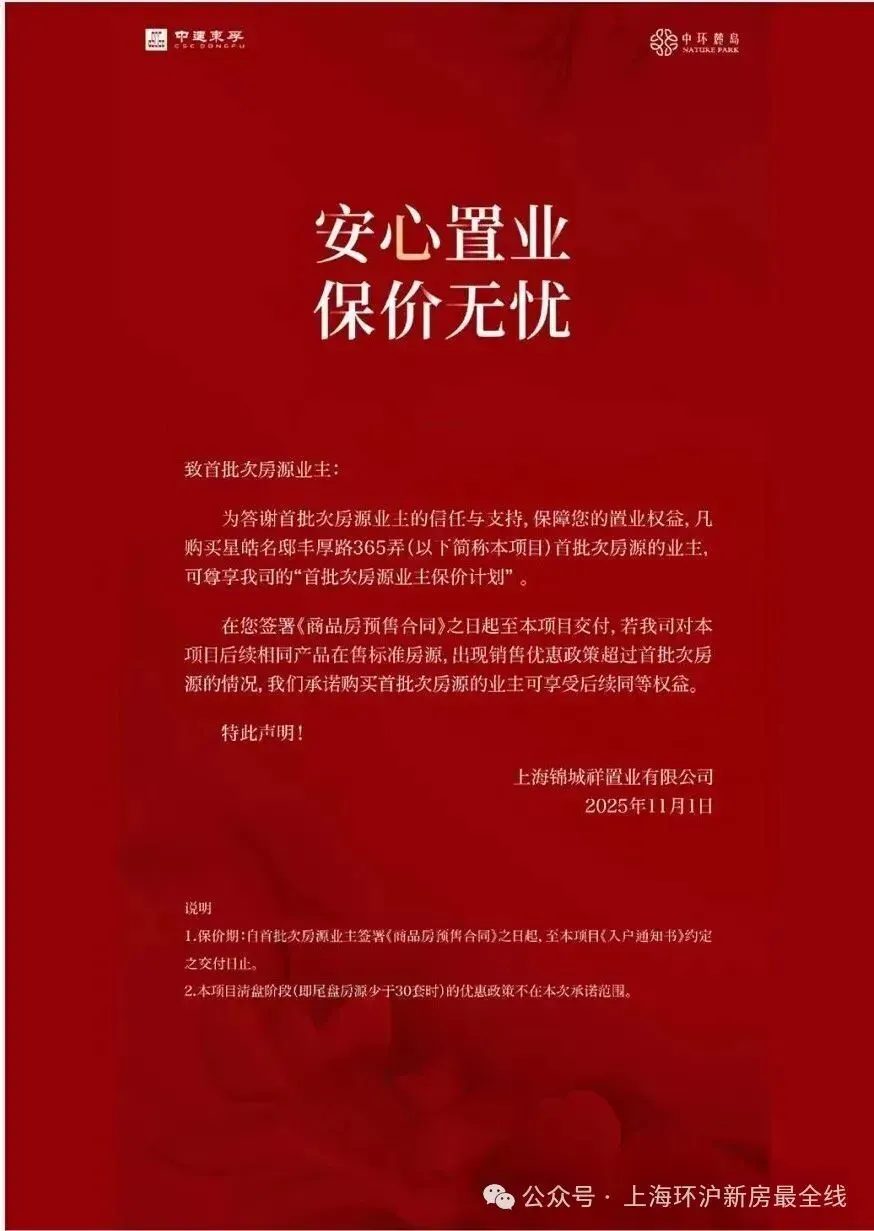 上海第二个作出“保价”承诺的项目,11月1日,中环麓岛项目也发布了公告:凡购买首批次房源的业主,可享“首批次房源业主保价计划”: