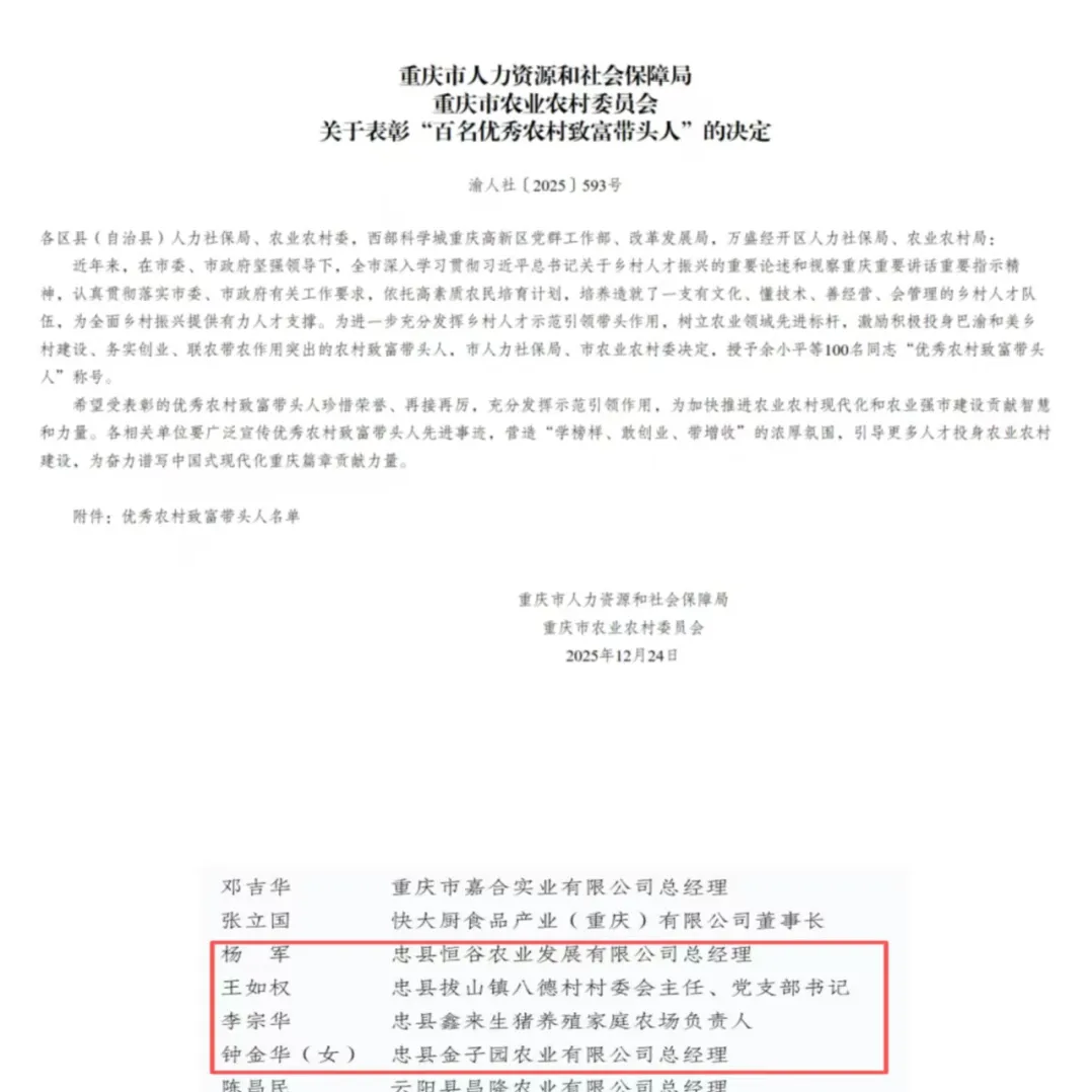 1月,忠县杨军、王如权、李宗华、钟金华4名同志入选2025年重庆市“百名优秀农村致富带头人”名单,为全县农业农村现代化发展树立榜样作用。