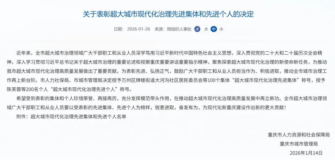 1月,市人力社保局、市城市管理局联合开展的超大城市现代化治理先进集体和先进个人评选工作中,忠县城市管理综合行政执法支队获评重庆市超大城市现代化治理先进集体,忠县智慧城管信息中心主任汤会蓉、忠县公安局交通巡逻警察大队副大队长胡兆军获评超大城市现代化治理先进个人。