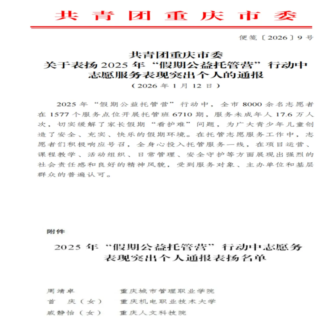 1月,共青团重庆市委印发《关于表扬2025年“假期公益托管营”行动中志愿服务表现突出个人的通报》(便笺〔2026〕9号),对全市在托管志愿服务中表现优异的个人予以通报表扬。其中,我县周靖卓、首庆、戚静怡3名优秀青年志愿者光荣上榜。