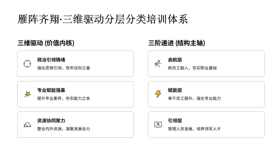模型的核心是“三维驱动”,即“政治铸魂、专业强基、资源聚力”。这三者构成一个稳固的价值三角与动力中枢,是所有培训设计、活动开展与赋能行动必须遵循的根本准则、聚焦的核心领域与驱动的力量源泉。