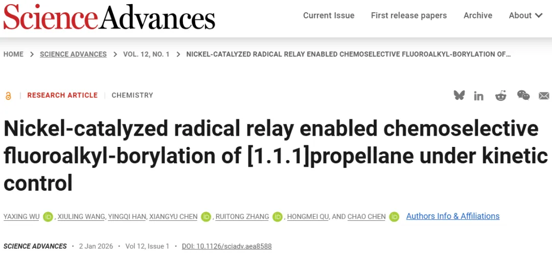 Yaxing Wu et al., Nickel-catalyzed radical relay enabled chemoselective fluoroalkyl-borylation of [1.1.1]propellane under kinetic control. Sci. Adv.12, eaea8588(2026). DOI:10.1126/sciadv.aea8588