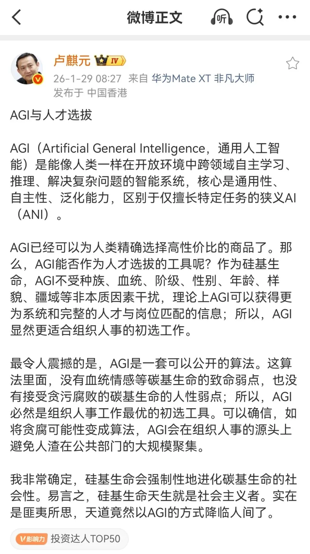 我非常确定,硅基生命会强制性地进化碳基生命的社会性。易言之,硅基生命天生就是社会主义者。实在是匪夷所思,天道竟然以AGI的方式降临人间了。