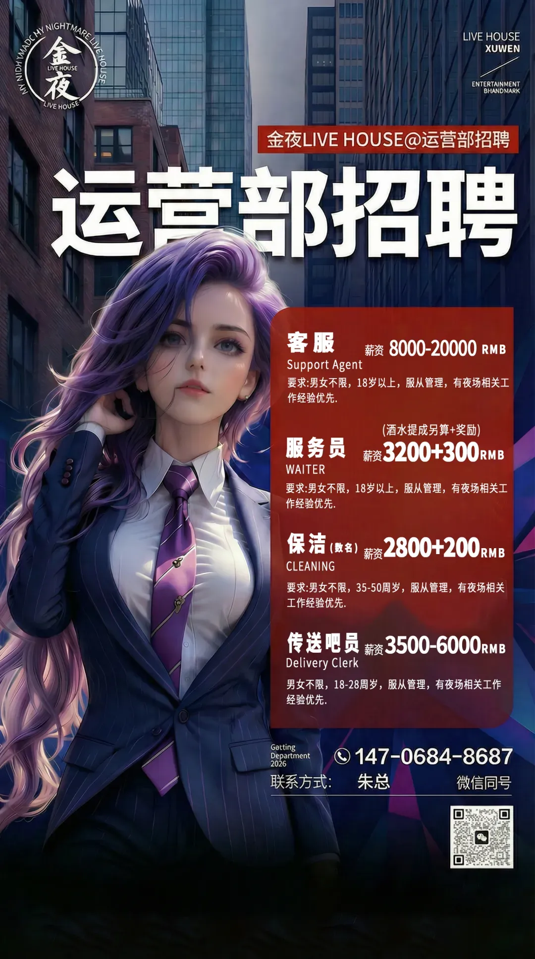工作要求:男女不限,20岁以上,服从管理,有夜场相关工作经验优先。