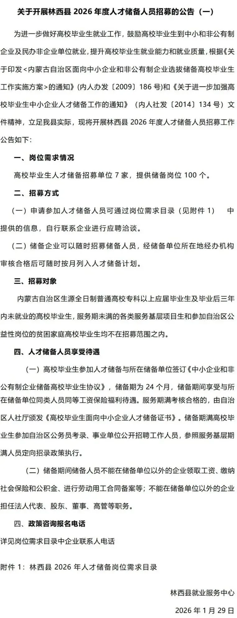 >赤峰市林西县2026年度人才储备人员招募100个岗位