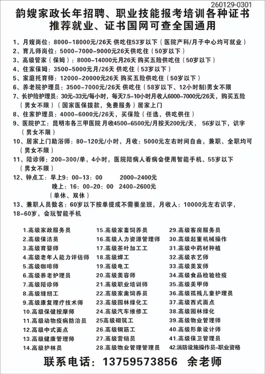 保洁 薪资 2300-3000元(55 岁以下()以上岗位统一培训上岗,月休2天,提供晚餐、宵夜薪资=底薪+提成+岗位薪资+全勤奖+住房补助+工龄+绩效+节日福利应聘电话:13700619233 18314410622(微信同号)地址:宜良县汇东西路良城美景商业中心好声音 KTV