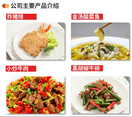 产品:猪肉类、禽肉类、水产类、牛肉类四大类,速冻肉制半成品菜