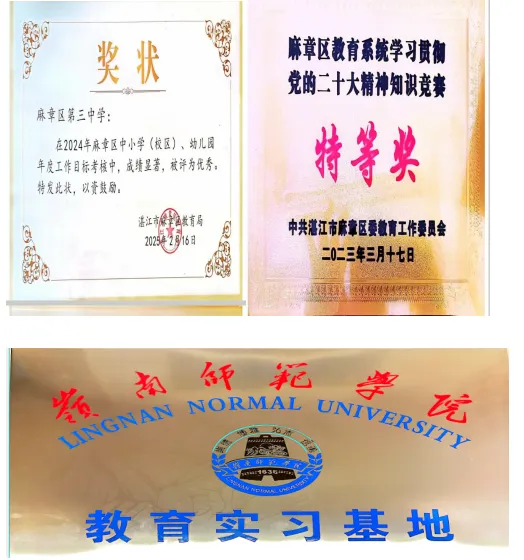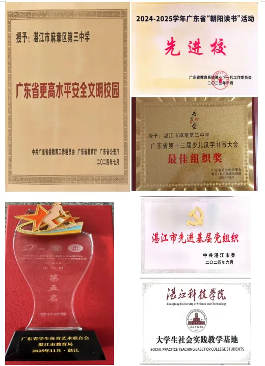 办学以来,学校先后获评“广东省校园篮球推广学校”“广东省更高水平安全文明校园”“湛江市规范化学校”“湛江市文明校园”“湛江市先进基层党组织”等称号,2025年11月学校荣获广东省中小学生跳绳公开赛(湛江站)暨“奔跑吧·少年”中小学生跳绳锦标赛小学组第五名(湛江市第一名)、2024--2025广东省“朝阳读书”活动先进校、岭南师范学院教育实习基地,办学规范性与综合实力获得广泛认可。