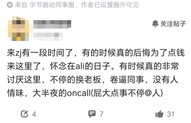 最近刷职场社区,偶然刷到字节跳动同事圈的一条匿名帖,越看越扎心,说真的,差点看破防。发帖的朋友吐槽,来字节也有一阵子了,有时候半夜躺在床上复盘,真的悔得肠子都青了——当初就为了那点薪资涨幅,脑袋一热就从阿里跳过来了。说实话,看到这话我心里咯噔一下——这不就是很多职场人的真实写照?为了多赚点钱扛着压力跳槽,到最后钱没赚明白,心情倒全被搞砸了。发帖的朋友还吐槽,现在真的特别讨厌这里,首先就是老板换得太频繁,刚适应一个老板的做事风格,刚摸清楚他的要求,转眼就换了一个新的,又得重新磨合、重新适应,每天都在“破冰”,累得不行。这点我太能理解了,职场里最磨人的不是工作本身,而是频繁换领导。每个领导思路、侧重点都不一样,你好不容易跟上上一任的节奏,新领导一来全推翻,之前的努力全白费,那种挫败感,没经历过的人真不懂。除了频繁换老板,最让他崩溃的,还有那些“卷逼同事”。说真的,他嘴里的这种卷,绝对不是正常的努力打拼,就是实打实的无效内卷——别人下班不走,自己哪怕没事也得耗着;明明没必要加班,偏要装出一副忙到飞起的样子;更离谱的是,还有人偷偷内卷,抢活干、打小报告,整个团队氛围差到离谱,一点人情味都没有。这种内卷真的窒息,你不卷,就显得不上进;你跟着卷,身心都扛不住。本来上班就够累,还要时刻提防身边人,每天活得小心翼翼,一点都不自在。最让他怀念阿里的,应该是“人情味”。他说这里没有人情味,我太懂这种感受了。大厂里,很多时候大家都是“同事”,而不是“朋友”,上班一起干活,下班各自走散,没有多余的交流,也没有真心的关心。你生病、家里有事,没人真心问候;努力做完难活,没人真心夸赞;就算遇到困难求助,别人也敷衍了事,生怕你麻烦他。这种冷冰冰的环境,待久了心里真发寒。还有最让他破防的一点——大半夜的还要oncall,屁大点芝麻小事,就被人不停@,根本不管你是不是在休息。本来上班就够累了,好不容易熬到下班,想卸下疲惫好好歇会儿、睡个安稳觉,结果手机一响,全是@你的消息,点开一看,全是无关紧要的小事,压根没必要大半夜特意打扰人。这种私人时间被无限侵占的感觉,真的瞬间破防。我们上班是为了生活,不是把生活过成上班,可现在很多人被工作绑架,连安稳觉都睡不好,长期下来身心俱疲。其实,发帖的朋友吐槽的,不只是他所在的这一家公司的问题,更是现在很多大厂的通病——频繁换领导、无效内卷、缺乏人情味、私人时间被侵占。我们总以为,为了钱,多吃点苦、多受点委屈没关系,可真的身处其中才发现,钱买不来开心,也买不来安稳。有时候,我们跳槽,不仅仅是为了更高的薪资,更是为了更好的工作环境、更舒心的团队氛围、更稳定的发展。可现实往往不尽如人意,很多时候,我们跳来跳去,反而越来越迷茫,越来越后悔。当然,笔者不是说跳槽不好,也不是说字节不好,每个公司都有自己的问题,也有自己的优势,每个职场人也都有自己的无奈。只是想跟大家说,找工作的时候,别只看薪资,也要多看看工作环境、团队氛围、领导风格,别等跳过去之后,才后悔当初的选择。