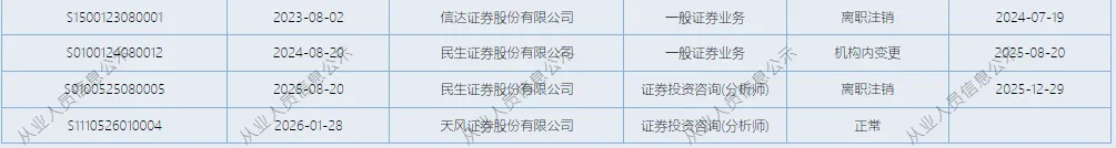 近日,证券从业系统显示,李劲锋,12月29日从民生证券离职,1月28日加入天风证券。李劲锋,民生证券非银行业分析师