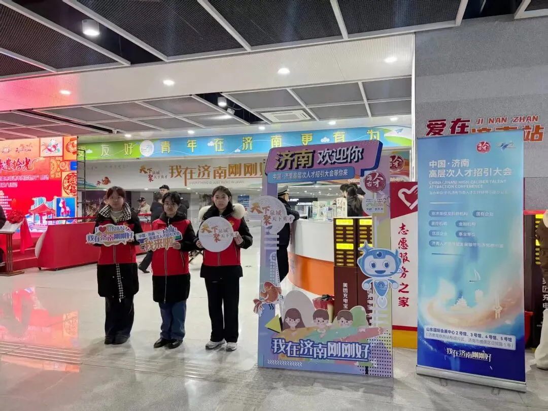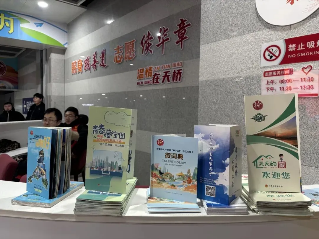 天桥区在济南站北站房出站口设置政策咨询台,详细介绍济南市在人才引进、培养、激励、服务等方面的创新举措。重点解读人才政策“双30条”中与青年学子密切相关的求职补贴、安居保障等内容,让政策成为吸引人才的“强磁场”。
