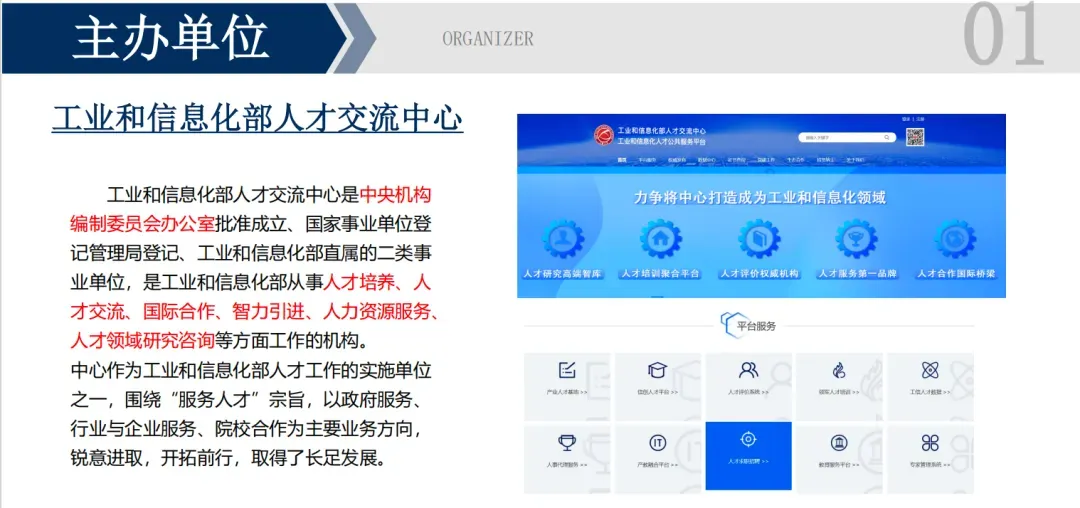 工业和信息化部人才交流中心(以下简称“中心”)创立于1985年1月,是中央机构编制委员会办公室批准成立、国家事业单位登记管理局登记、工业和信息化部直属的公益二类事业单位,是工业和信息化部从事人才研究、人才培训、人才评价、人才服务、国际合作等方面工作的专业机构。中心坚持“打造工业和信息化领域国际化、专业化的权威人才服务机构”为发展定位,以“为制造强国和网络强国建设提供人才服务支撑”为使命。